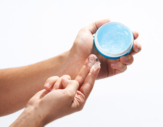 Trải đều sáp ra lòng bàn tay. Lấy một lượng nhỏ bằng đầu ngón tay. Do sản phẩm ở dạng gel nước, hãy dủng hai hoặc nhiều hơn hai ngón tay để lấy đủ lượng sáp cần thiết. Thoa đều ra lòng bàn tay