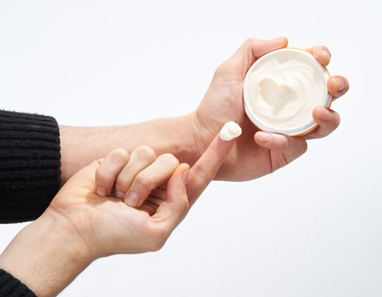Cho sáp tóc vào lòng bàn tay. Lấy một lượng nhỏ bằng đầu ngón tay. Chà hai tay với nhau để trải đều chúng ra cho đến khi trong suốt. Hãy để chúng len lỏi giữa các ngón tay của bạn